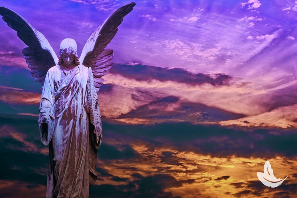 A statue of an angel with outstretched wings stands against a vibrant sunset sky with hues of purple, pink, and orange. A white dove symbol is visible in the bottom right corner.