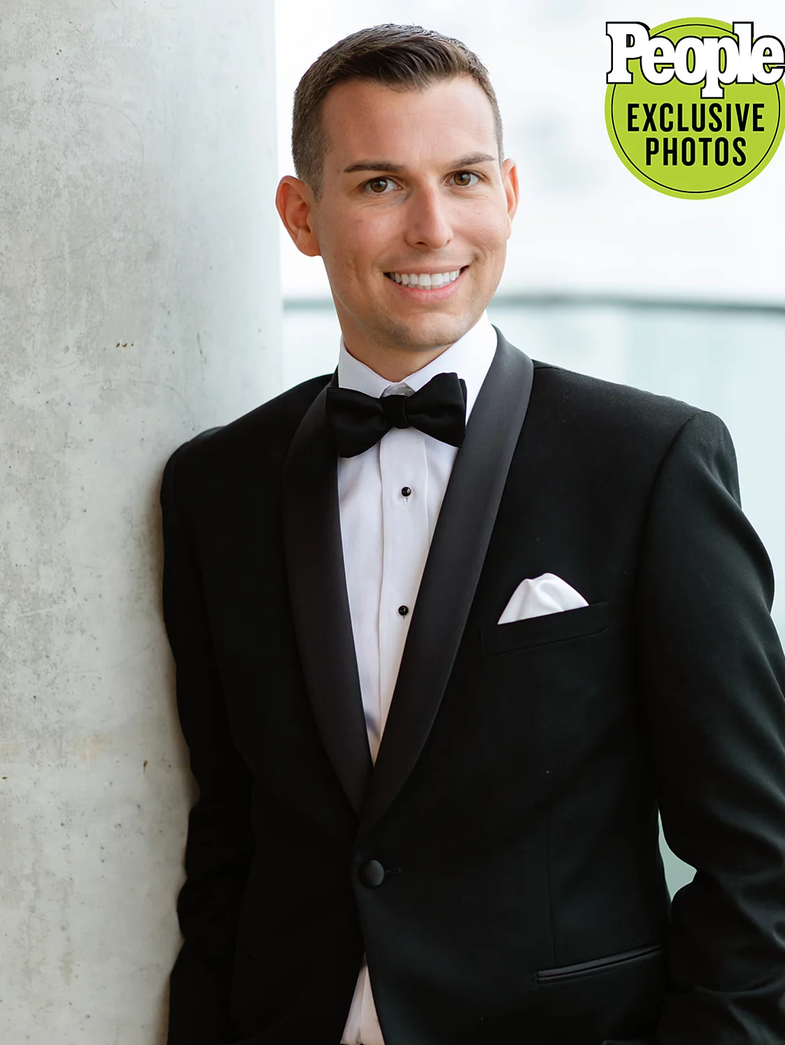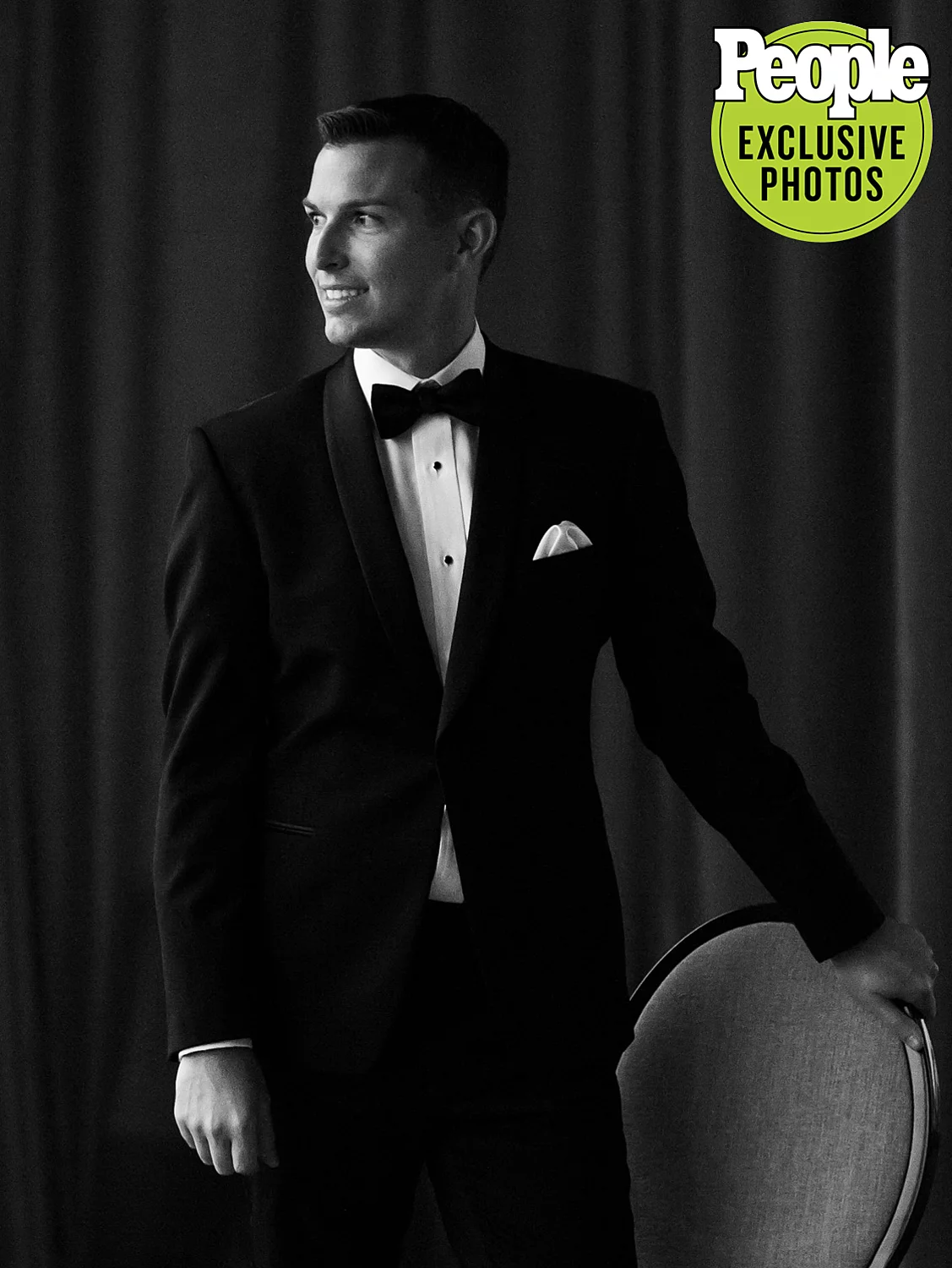 Fraser went “classic” with a black tuxedo, while his groomsmen wore complimentary white tuxes.